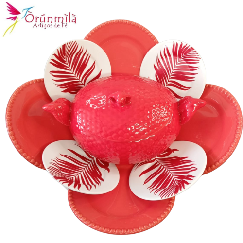 Iba para Ewá, com 4 pratos vermelhos ( 19 cm), 4 pratos desenho folha (15cm) uma sopeira oval (1800ml) na cor vermelha e detalhe de uma cabeça de cobra na ponta, e bacia branca 36cm.