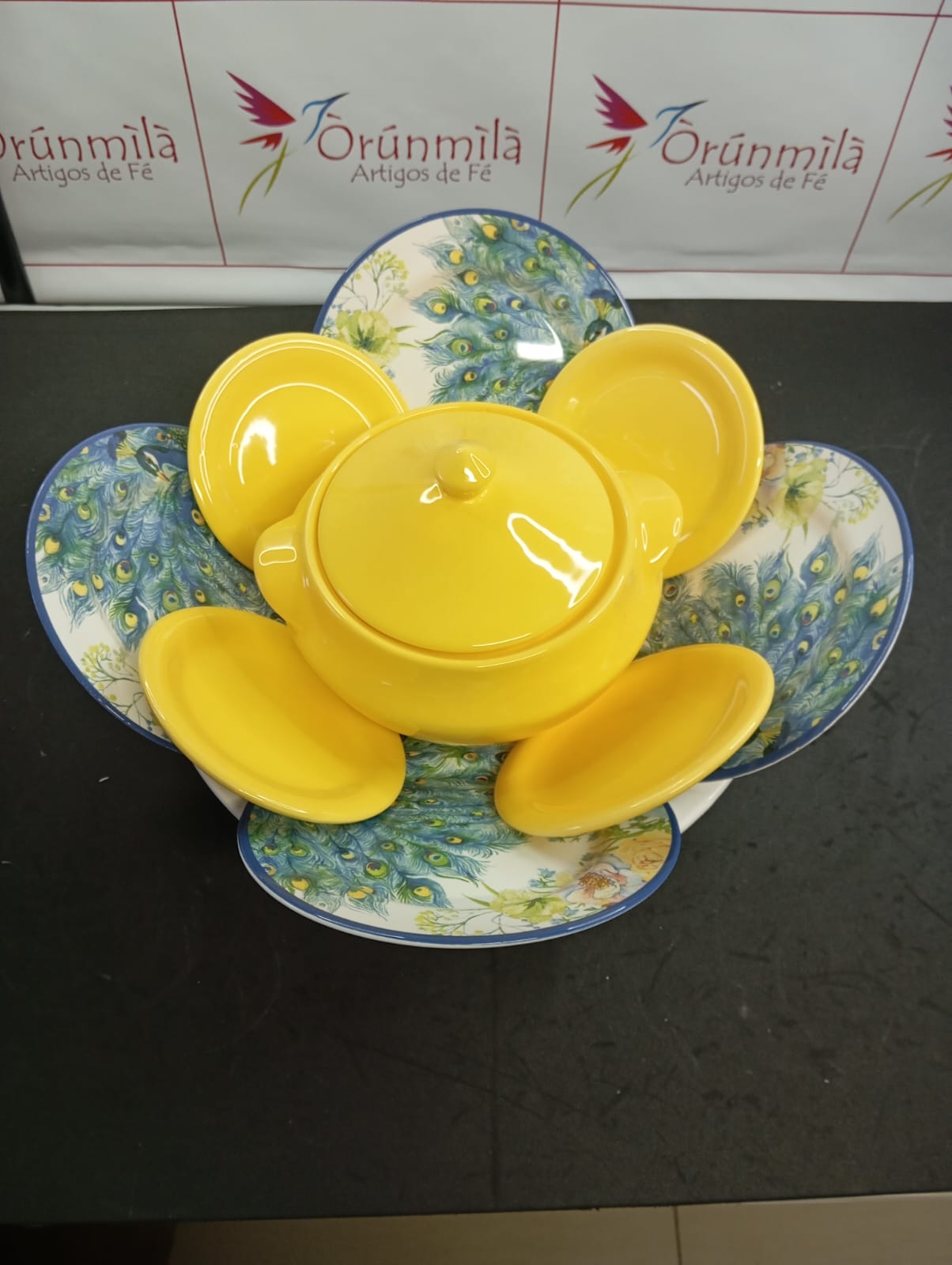 Iba para Logunedé, contendo 4 pratos medios estampa de pavao (19cm cada), 4 pratos menores amarelos (15cm cada) sopeira amarela de 2,100ml e bacia branca redonda 36cm .