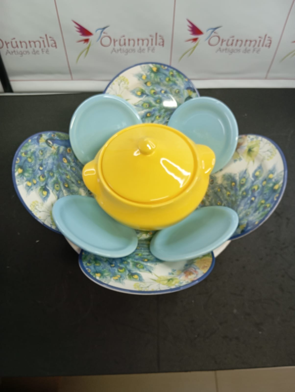 Lindo Iba para Logunedé, contendo 4 pratos medios estampa de pavão, (19cm cada), 4 pratos menores azul claro(14cm cada) sopeira amarela (2,100 ml) e bacia Branca 36cm .