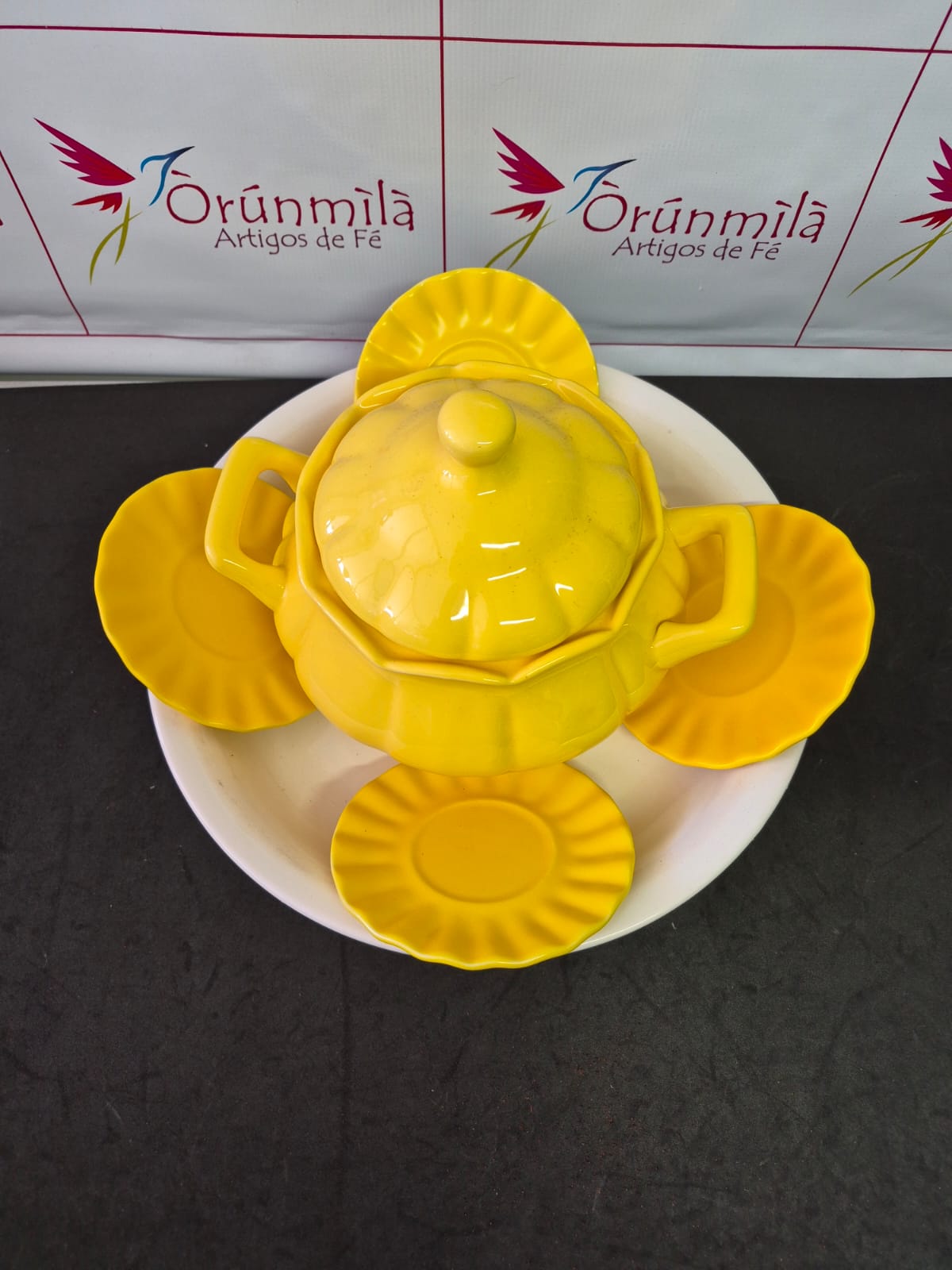 Iba para oxum com 1 sopeira de 2 litros 1 bacia branca de 36cm, 4 pires amarelo 15cm cada, 1 sopeira azul claro 2 litros