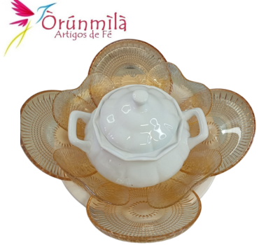 Iba para Oxum com 4 pratos medios de cristal cor ambar (20cm cada), 4 pratos pequenos cor ambar formato de coração(15cm cada) sopeira Branca de louça(2litros) e bacia branca 36cm.
