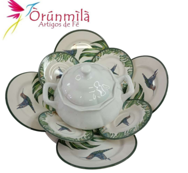 Iba de Oxossi contendo 4 pratos médios estampados desenho de passaros(19cm cada), 4 pratos menores estampados desenho de passaros(15cm cada),uma sopeira branca (2 litros), e uma bacia branca 36cm.