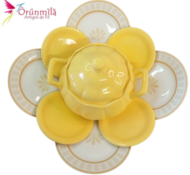 Iba para Oxum , com 4 pratos medios estampados(18cm cada), 4 pratos pequenos lisos cor amarela(15cm cada) sopeira amarela(2litros) e bacia branca 36cm.